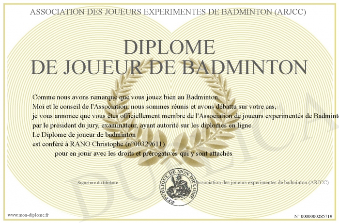 Envoyez par email votre Diplôme de joueur de badminton personalisé