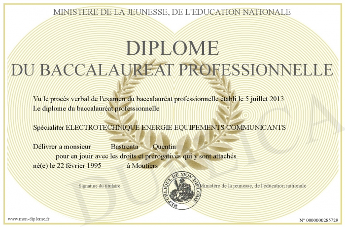 Envoyez par email votre Diplôme du baccalaureat professionnelle personalisé