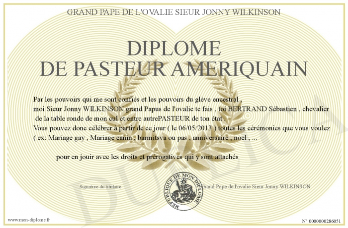 Envoyez par email votre Diplôme de pasteur amériquain personalisé