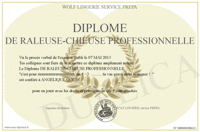 Envoyez par email votre Diplôme DE RALEUSE-CHIEUSE PROFESSIONNELLE personalisé