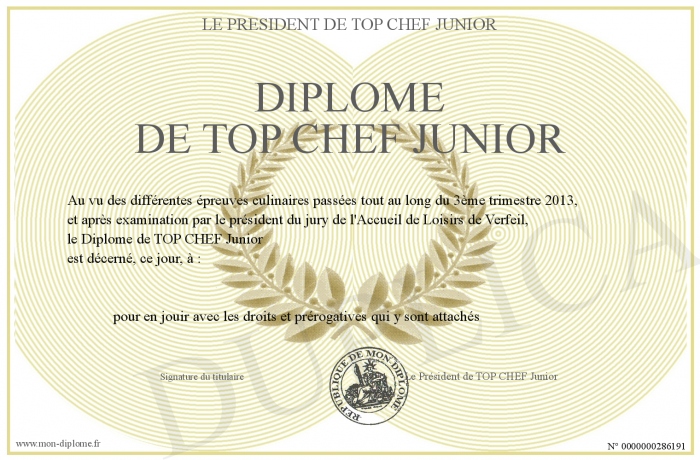 Envoyez par email votre Diplôme de TOP CHEF Junior personalisé