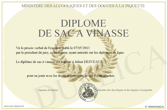 Envoyez par email votre Diplôme de Sac a vinasse personalisé