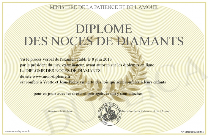 Envoyez par email votre DIPLOME DES NOCES DE DIAMANTS personalisé