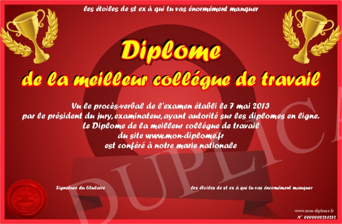 Envoyez par email votre Diplôme de la meilleur collégue de travail personalisé