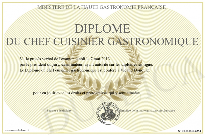 Envoyez par email votre Diplôme du chef cuisinier gastronomique personalisé