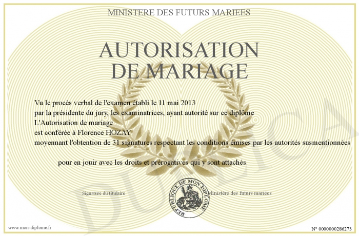 Envoyez par email votre Autorisation de mariage personalisé