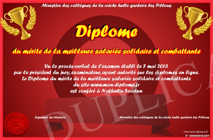 Envoyez par email votre Diplôme du mérite de la meilleure salariée solidaire et combattante personalisé
