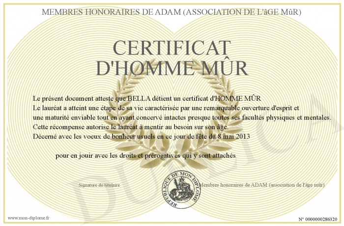 Envoyez par email votre Certificat d'HOMME MÛR personalisé