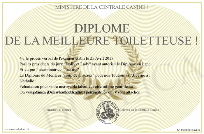 Envoyez par email votre Diplôme de la Meilleure Toiletteuse ! personalisé