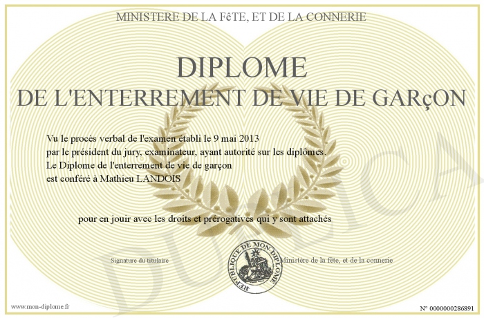 Envoyez par email votre Diplôme de l'enterrement de vie de garçon personalisé