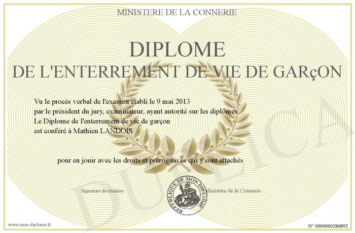 Envoyez par email votre Diplôme de l'enterrement de vie de garçon personalisé