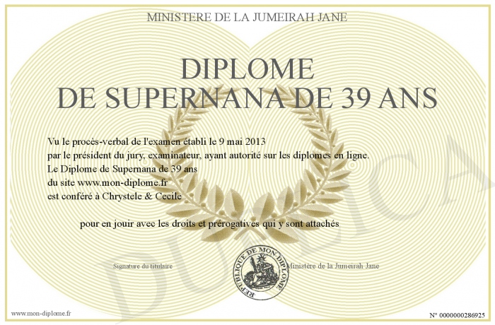 Envoyez par email votre Diplôme de Supernana de 39 ans personalisé