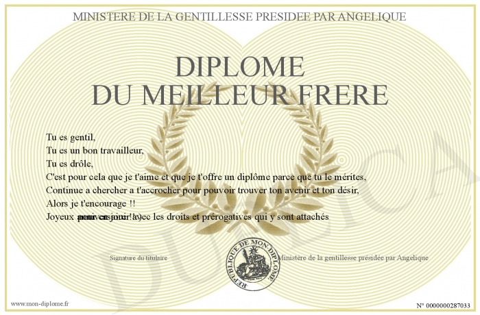 Envoyez par email votre Diplôme du meilleur frère personalisé