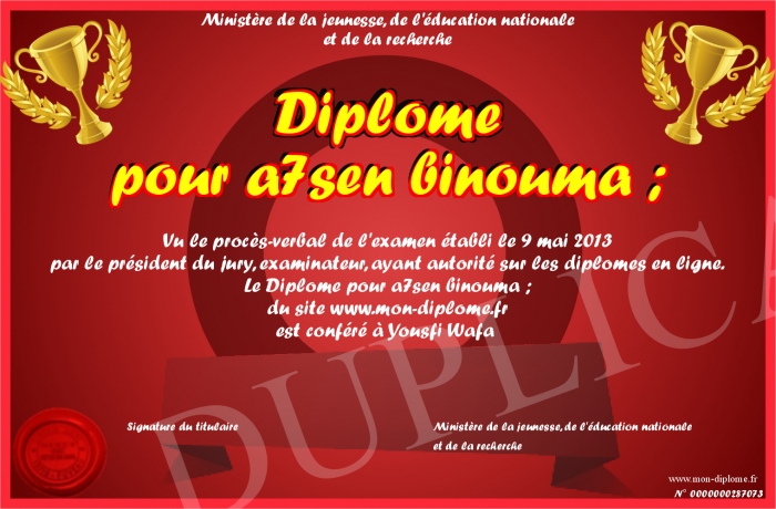 Envoyez par email votre Diplôme pour a7sen binouma ; personalisé