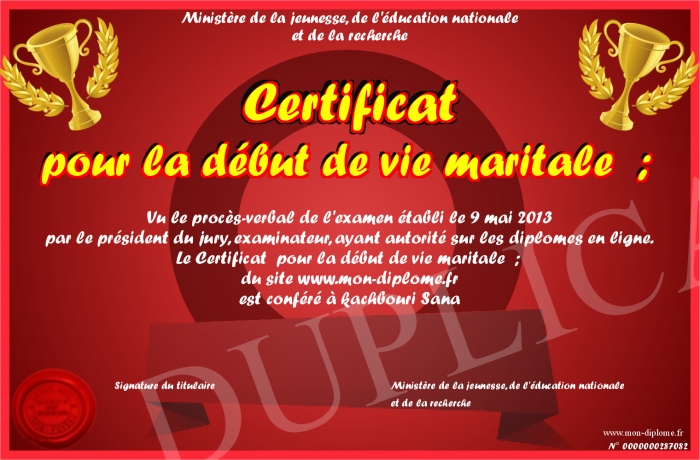 Envoyez par email votre Certificat pour la début de vie maritale ; personalisé