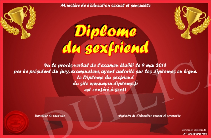 Envoyez par email votre Diplôme du sexfriend personalisé