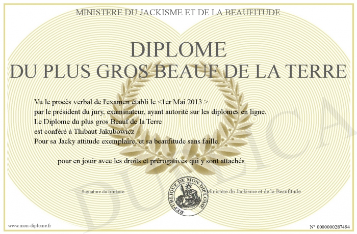 Envoyez par email votre Diplôme du plus gros Beauf de la Terre personalisé