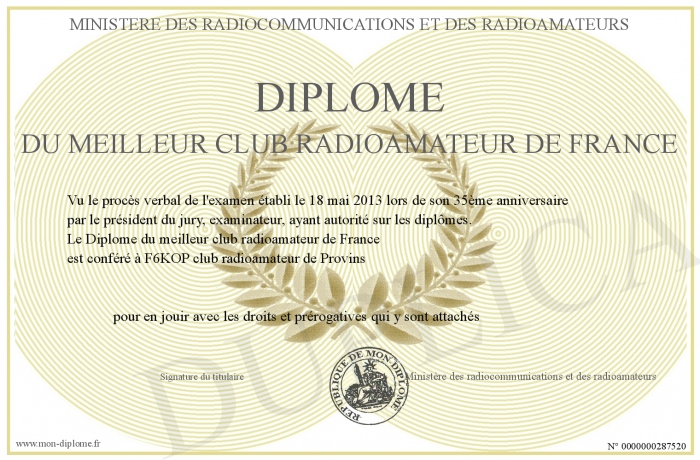 Envoyez par email votre Diplôme du meilleur club radioamateur de France personalisé