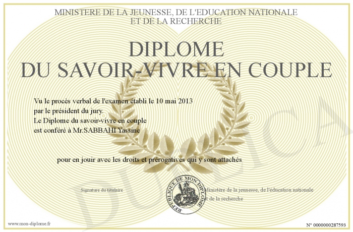 Envoyez par email votre Diplôme du savoir-vivre en couple personalisé