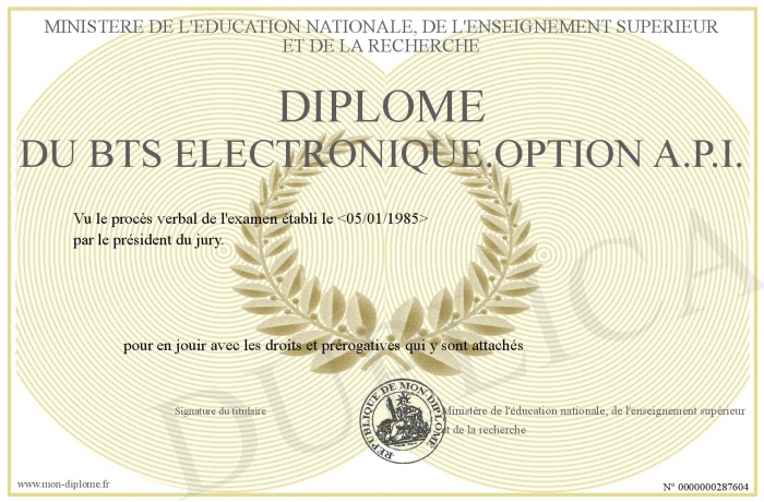 Envoyez par email votre Diplôme du BTS Electronique.Option A.P.I. personalisé