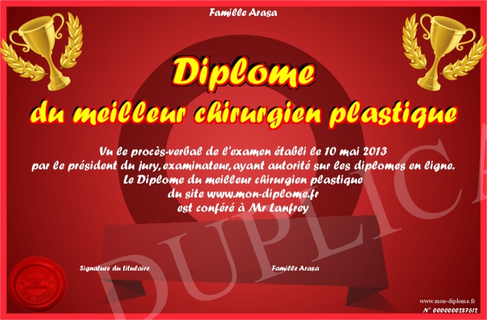 Envoyez par email votre Diplôme du meilleur chirurgien plastique personalisé