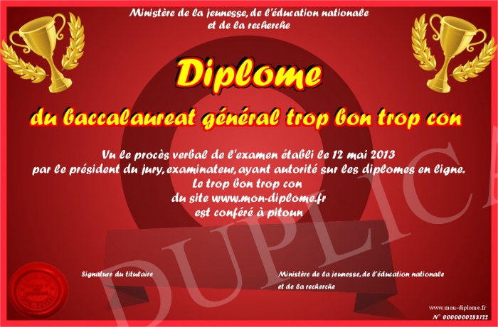 Envoyez par email votre Diplôme du baccalaureat général trop bon trop con personalisé