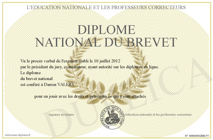 Envoyez par email votre Diplôme national du brevet personalisé