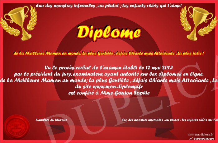 Envoyez par email votre Diplôme de la Meilleure Maman au monde; La plus Gentille , défois Chiante mais Attachante , La plus jolie ! personalisé