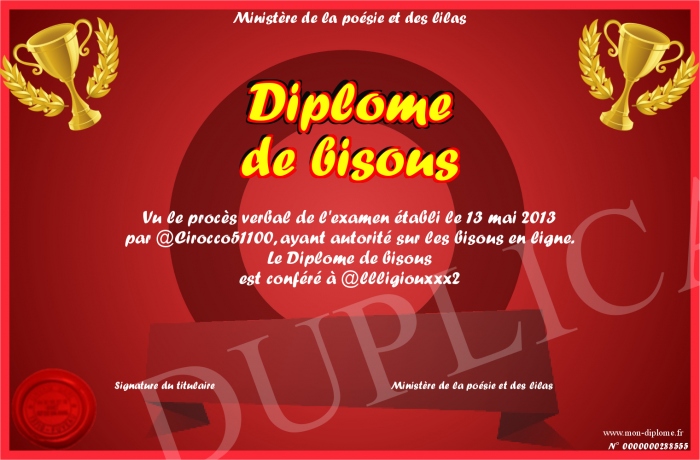 Envoyez par email votre Diplôme de bisous personalisé