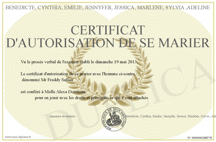 Envoyez par email votre certificat d'autorisation de se marier personalisé