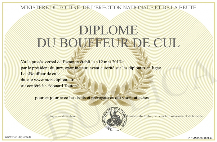 Envoyez par email votre Diplôme du Bouffeur de cul personalisé
