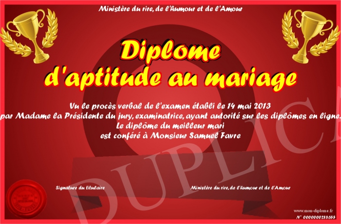 Envoyez par email votre Diplome d'aptitude au mariage personalisé