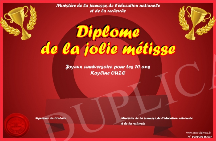 Envoyez par email votre Diplôme de la jolie métisse personalisé