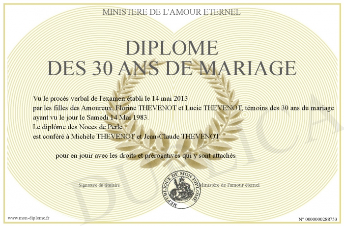 Envoyez par email votre Diplome des 30 ans de mariage personalisé