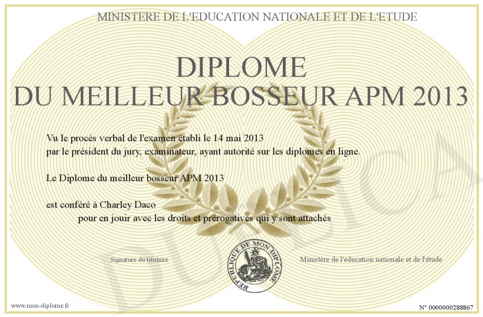 Envoyez par email votre Diplôme du meilleur bosseur APM 2013 personalisé