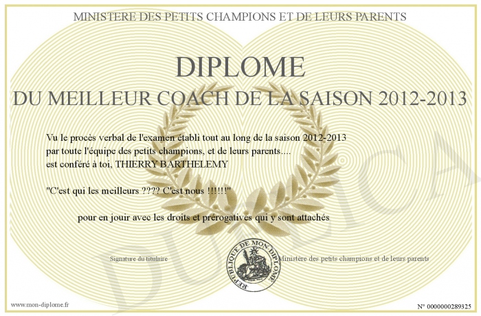 Envoyez par email votre Diplome du meilleur coach de la saison 2012-2013 personalisé