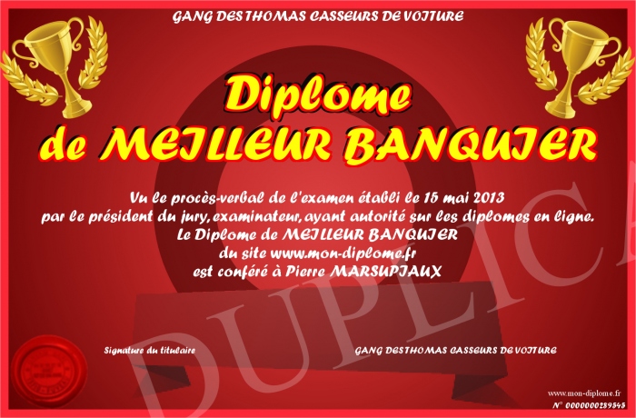 Envoyez par email votre Diplôme de MEILLEUR BANQUIER personalisé