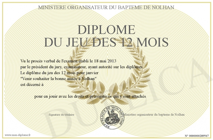Envoyez par email votre Diplôme du jeu des 12 mois personalisé