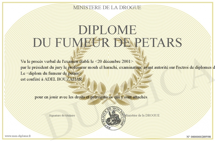 Envoyez par email votre Diplôme du FUMEUR DE PETARS personalisé