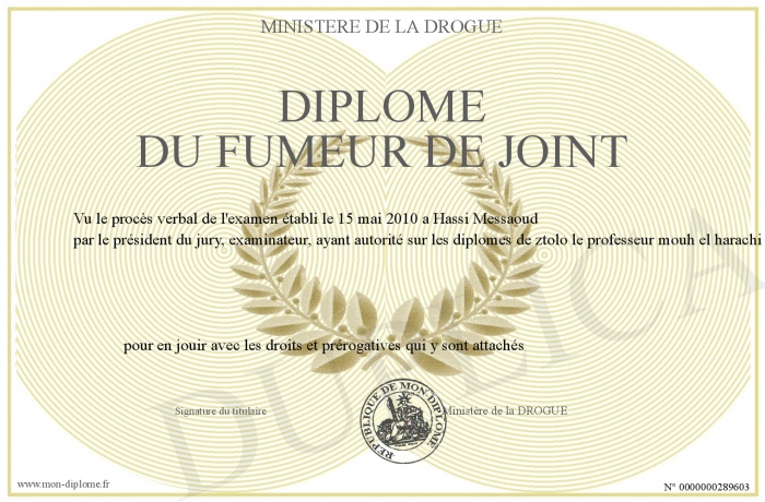 Envoyez par email votre Diplôme du FUMEUR DE JOINT personalisé