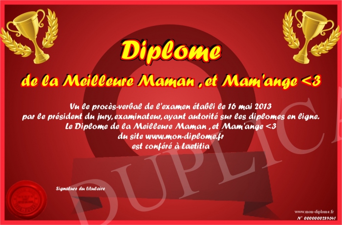 Envoyez par email votre Diplome de la Meilleure Maman , et Mam'ange -3 personalisé