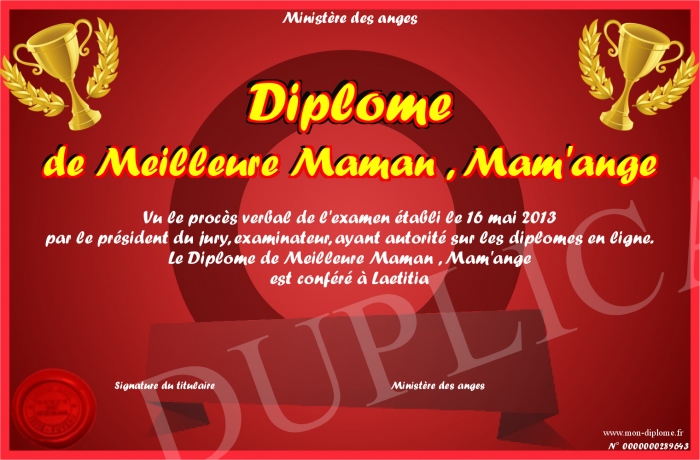 Envoyez par email votre Diplôme de Meilleure Maman , Mam'ange personalisé