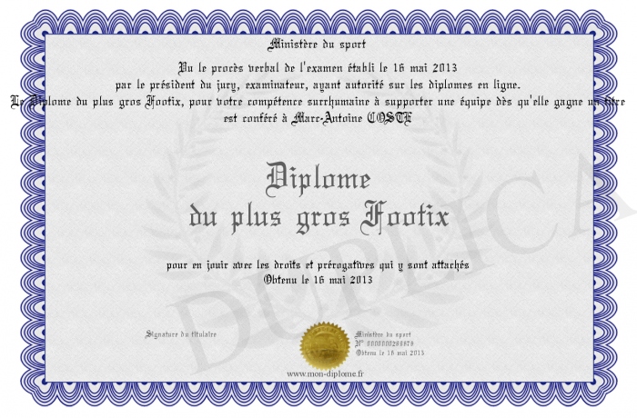Envoyez par email votre Diplôme du plus gros Footix personalisé