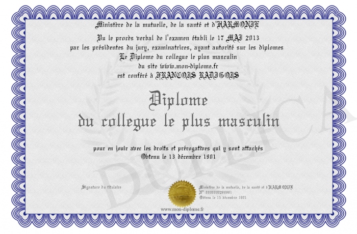 Envoyez par email votre Diplôme du collegue le plus masculin personalisé