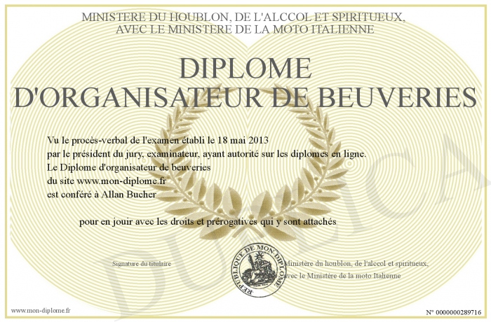 Envoyez par email votre Diplôme d'organisateur de beuveries personalisé