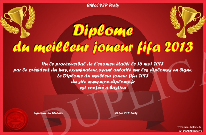 Envoyez par email votre Diplôme du meilleur joueur fifa 2013 personalisé