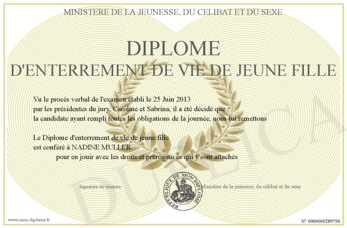 Envoyez par email votre Diplôme d'enterrement de vie de jeune fille personalisé