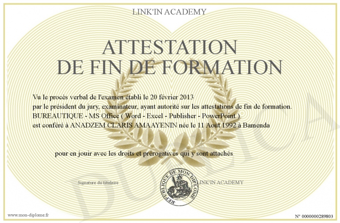 Envoyez par email votre ATTESTATION de FIN DE FORMATION personalisé