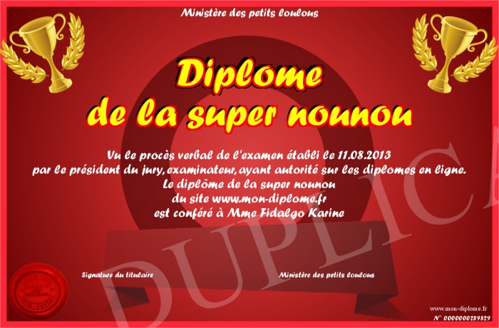 Envoyez par email votre Diplôme de la super nounou personalisé