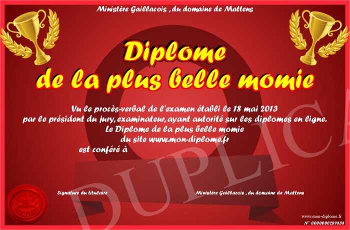 Envoyez par email votre Diplôme de la plus belle momie personalisé